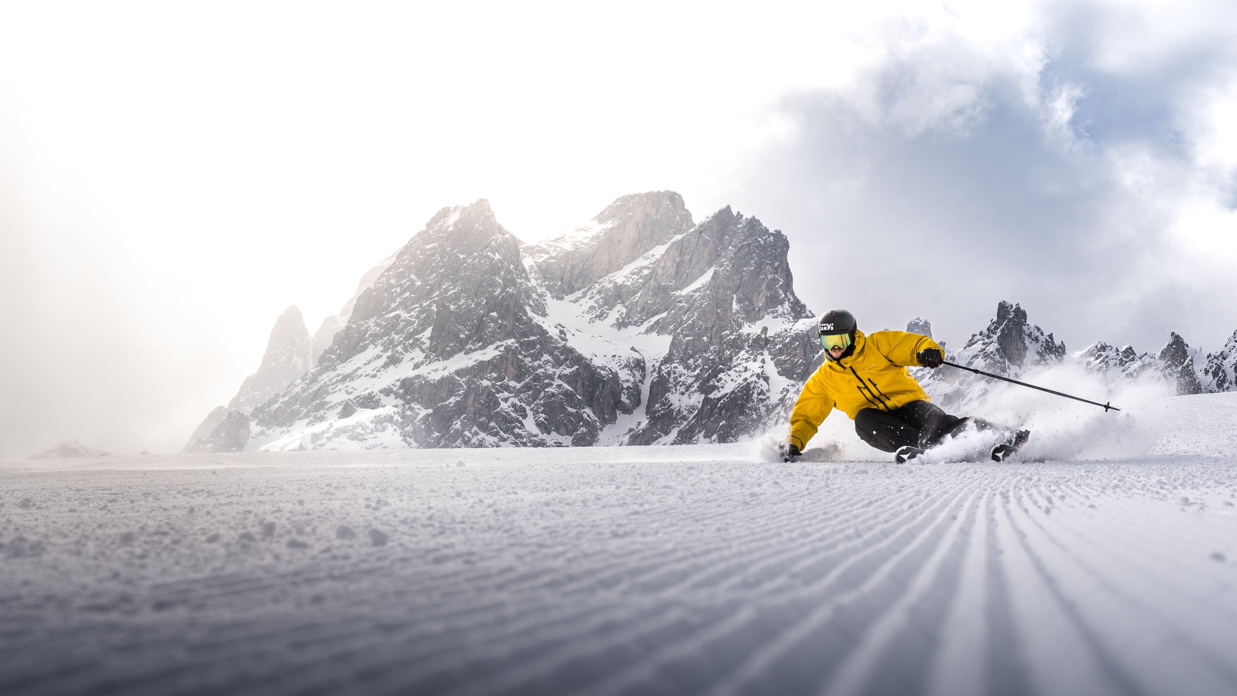 So, I had ideas of creating similar photos in the Dolomites. I was there with Jens and Quirin from Stomp It Camps, and the objective was to photograph skiing in front of the iconic range to promote the Stomp It Dolomites Camp — a new product this year that was immensely popular, in part because of the beauty of the location and the quality of the slopes.